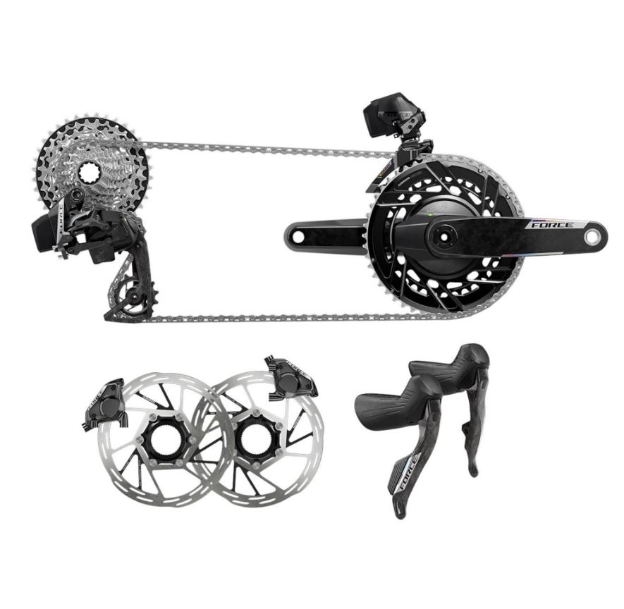 Aftermarket groupset includes rear derailleur, front derailleur, shift-brake controls, chain, disc brake calipers, rotors, battery charger