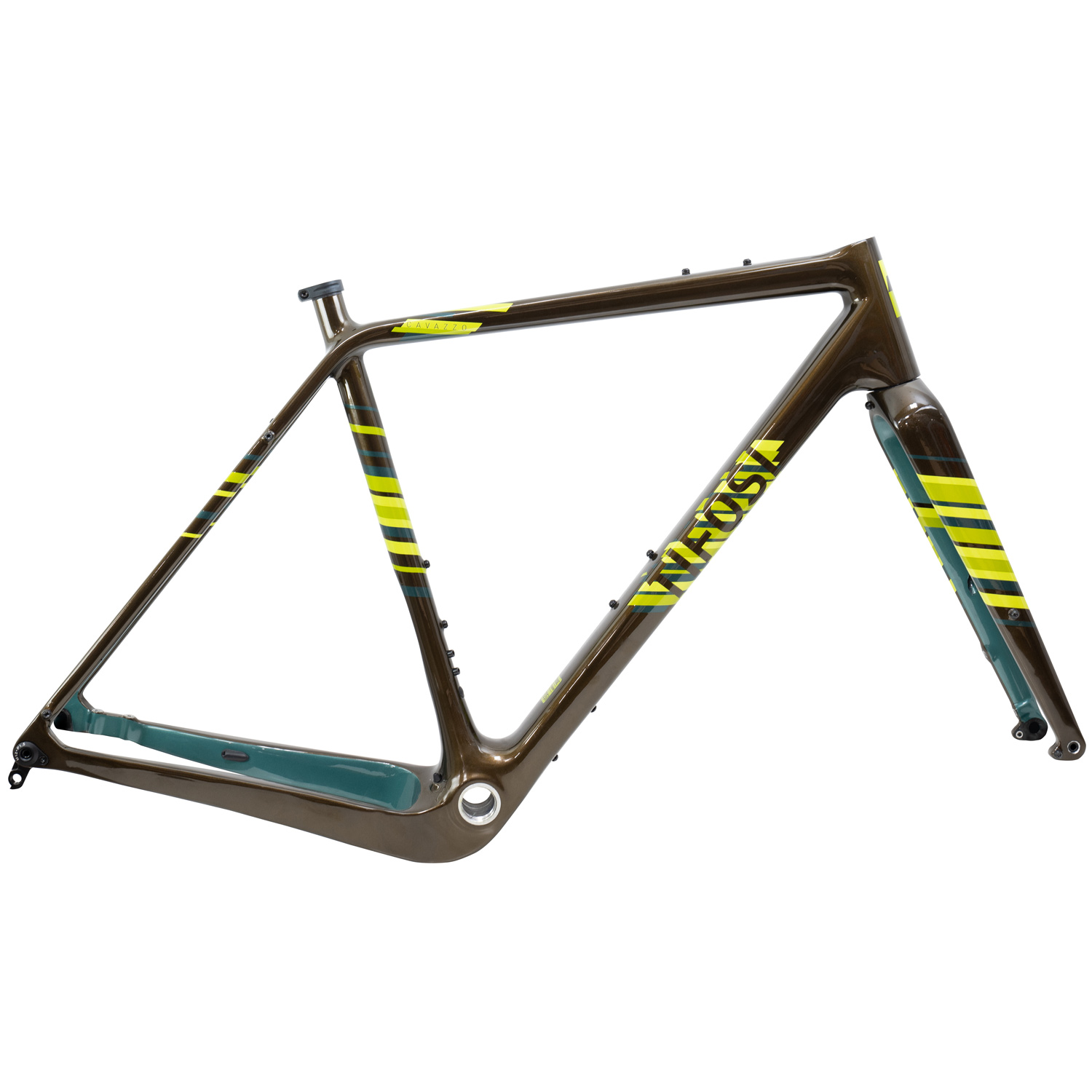 The Cavazzo's frame design utilises a mix of Toray T500 and T700 carbon fibre to provide the perfect balance of strength, stiffness and weight. The dropped rear stays are designed to suit 1x or 2x drivetrains and the short chainstay length is perfect for agile handling. To suit the Cavazzo's go anywhere design, the frame has mudguards bosses with clearance for up to 50mm guards and tyre clearance for 700c x 45mm or 650b x 2.1" tyres.