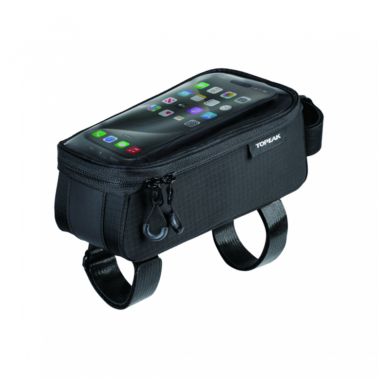 A top tube bag and phone case 2-in-1 design, featuring a transparent protective film that allows you to operate your phone while it's inside the bag. The second compartment of the bag features dividers that allow you to easily organize and store small items such as credit cards, loose change, keys, and other personal belongings.
